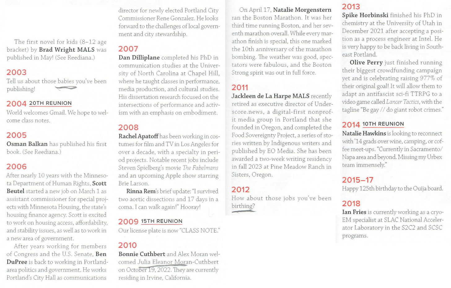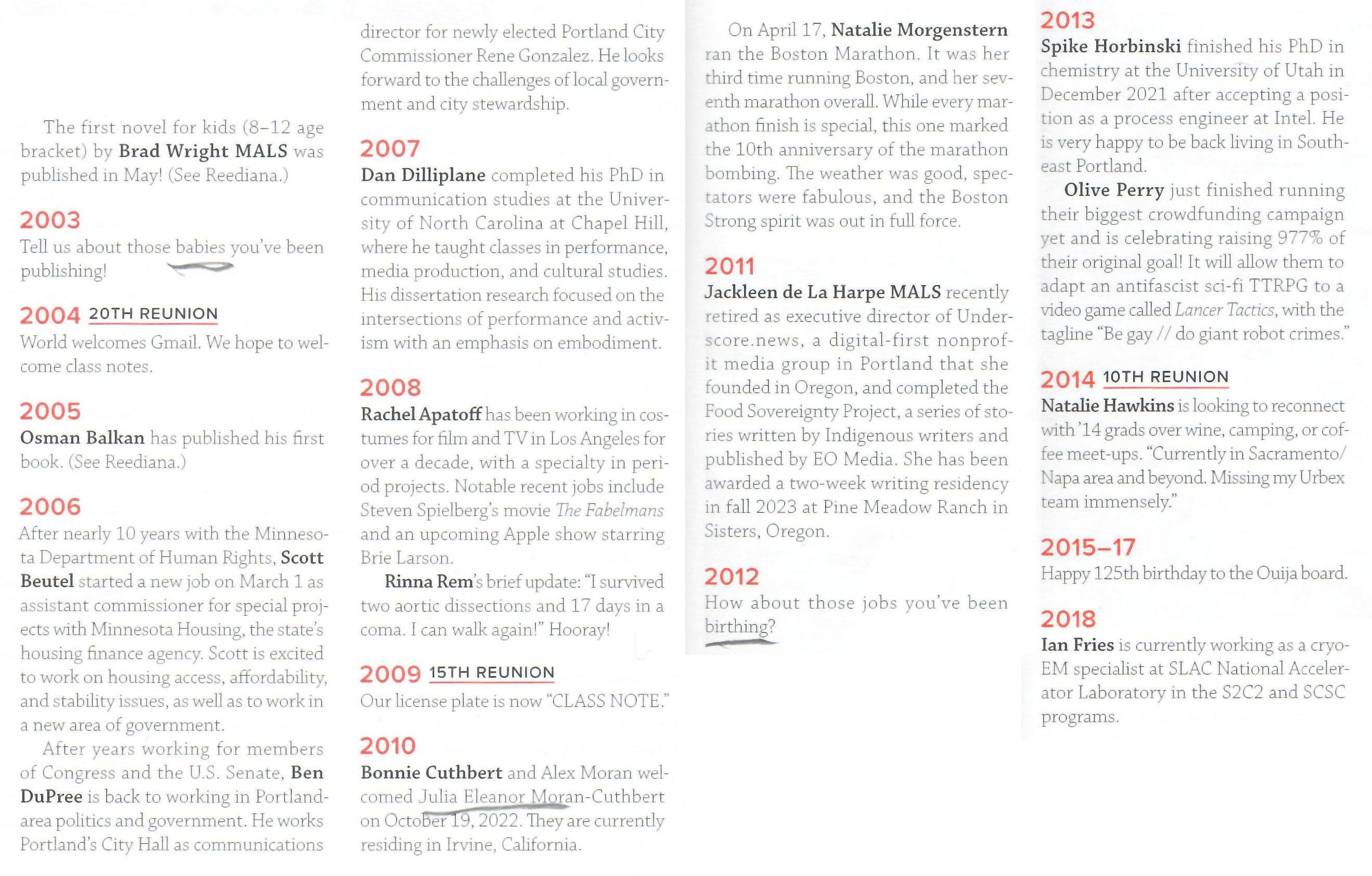 The Class Notes section is the most telling. Here are the notes for the classes of 2002 to 2018. There were no notes for more recent classes. What do we see?