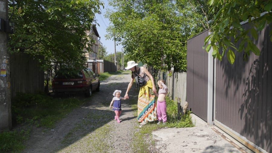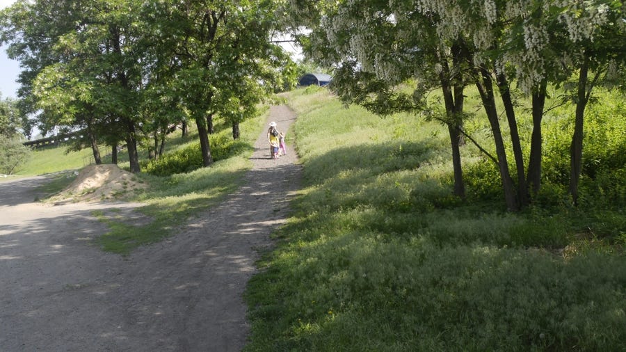 The pictures I took will give you a good idea of the neighborhood we live in. This is the dirt road leading to the station where we catch regional trains. Marianna had dawdled, lagging behind a couple of hundred feet, and this is Oksana welcoming her as she rejoined us.