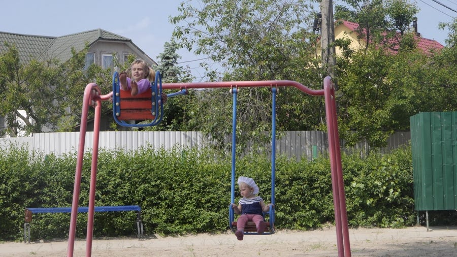 The kids spent half an hour on the swing. When Zoriana finally got tired of the swing on the left, I went to take Marianna out of hers. She immediately walked over to Zoriana's and wanted to swing some more. As you can gather from this picture, Zoriana goes as high as she can. She has no fear. Marianna is content to go at a slower pace.