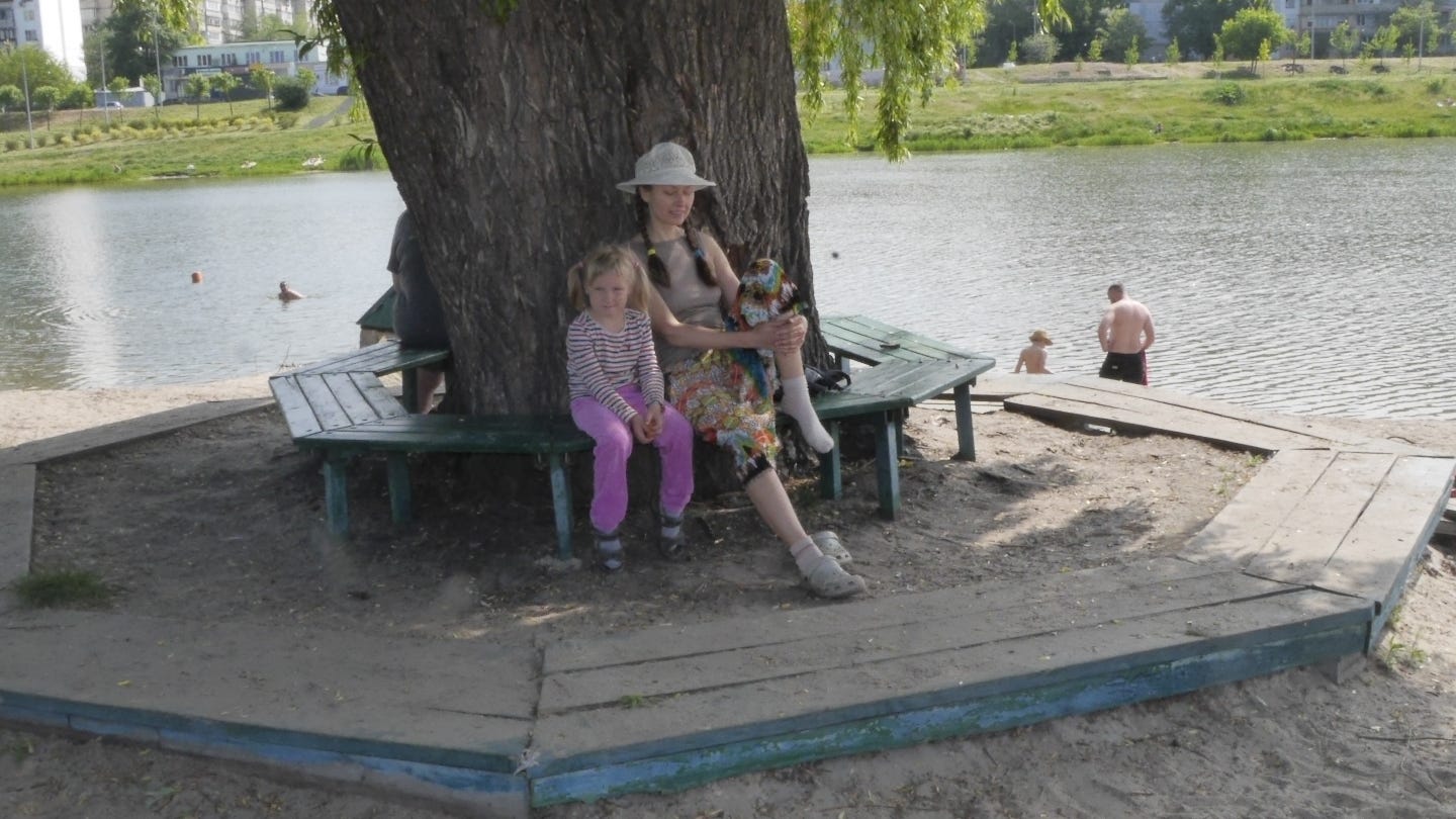 Here are Oksana and Marianna cooling it in the shade of the big willow. As you can see, the lake is very swimmable when the weather is right.