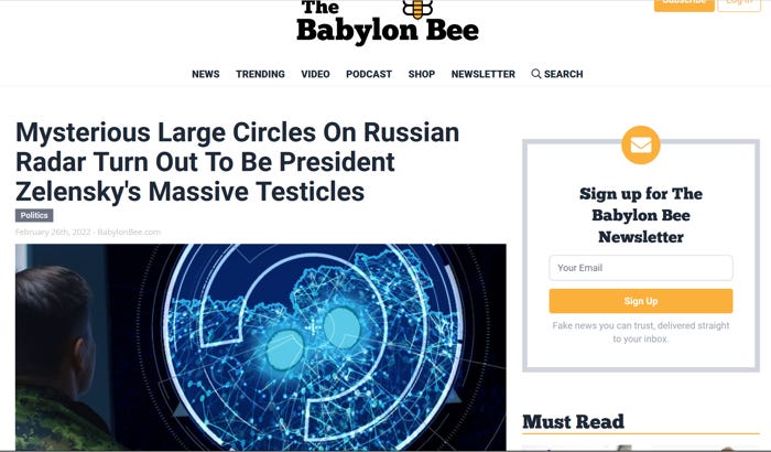 Pres Zelensky has risen in my eyes as a true courageous helper. Nice Babylon Bee reference, too!